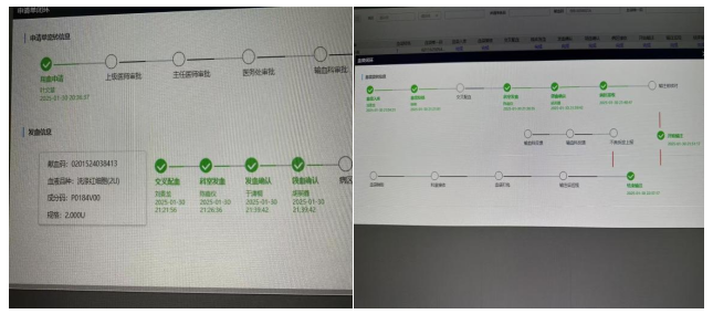 大年初二夜里,肿瘤患者病情变化,红细胞计数:1.42*10^12/L,血红蛋白:47g/L,血小板:12*10^9/L,情况非常危急。急需输注A型洗涤红和A型血小板。可洗涤红及血小板一般都是需要提前预约的。医学检验中心何主任立即与血站站长取得联系并多次沟通,最终顺利拿到血站仅有的一个单位A型血小板。同时在医院车队高效配合下,一个小时内完成血袋发放,上演了一场惊心动魄的救援。