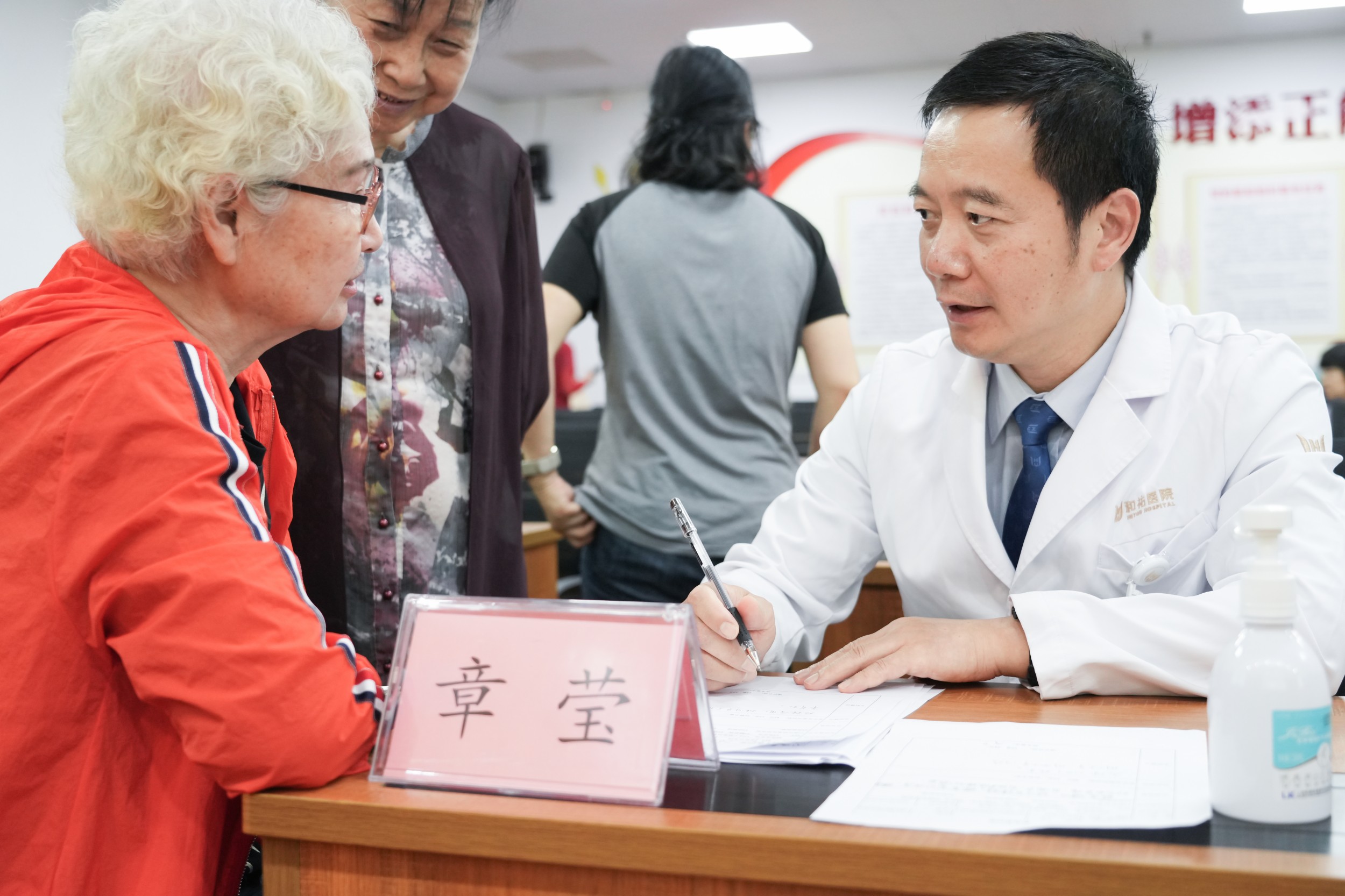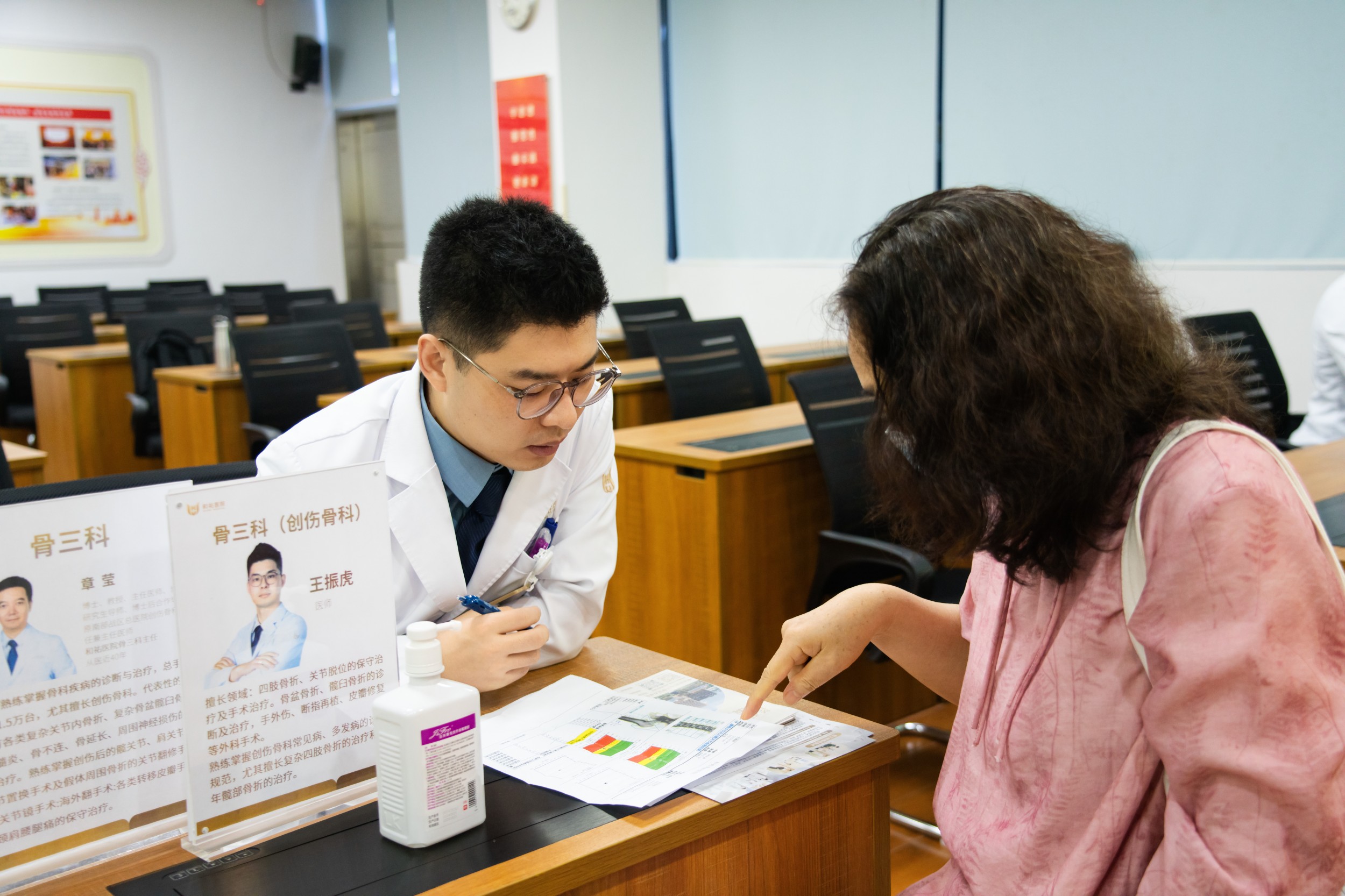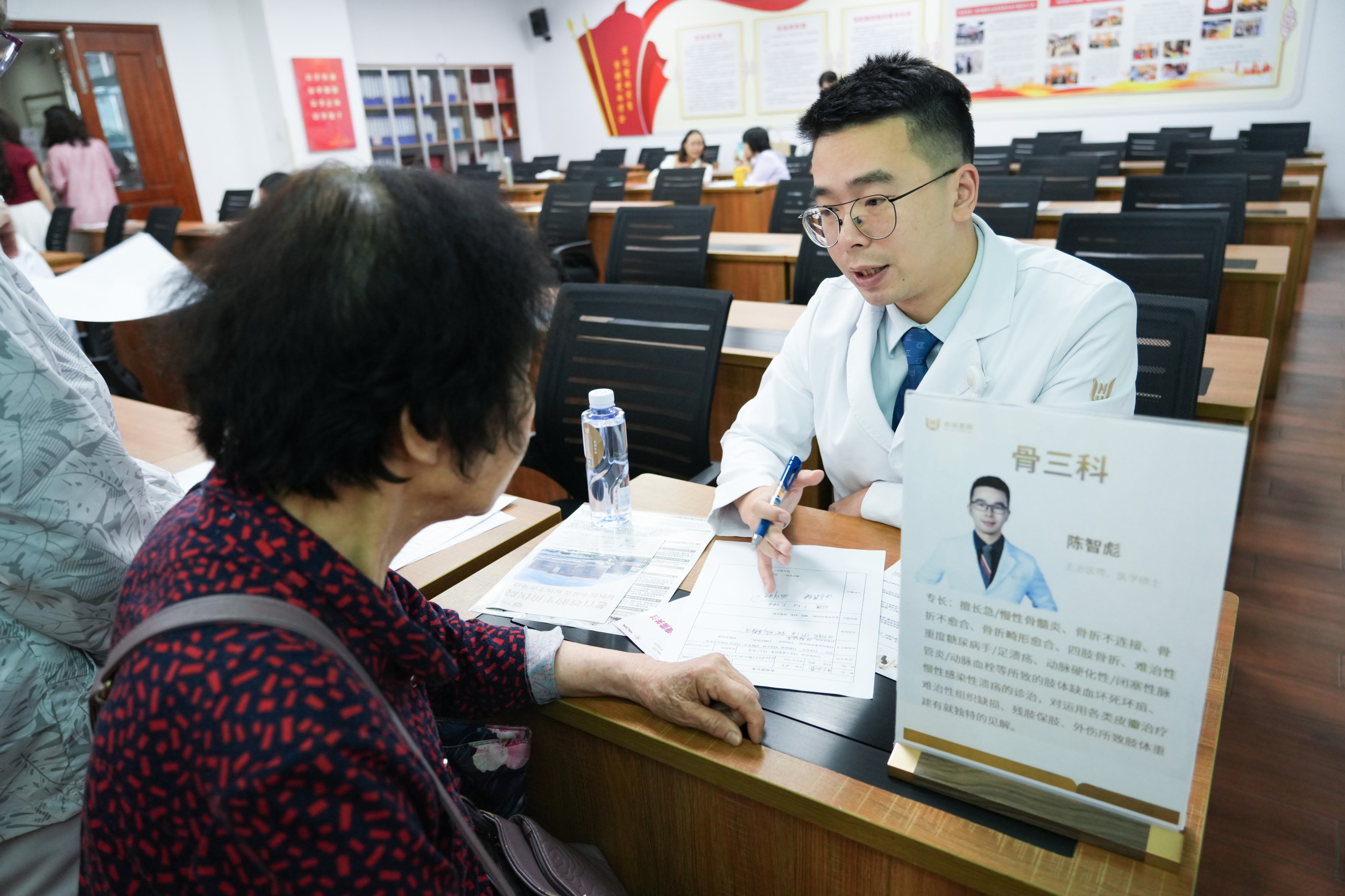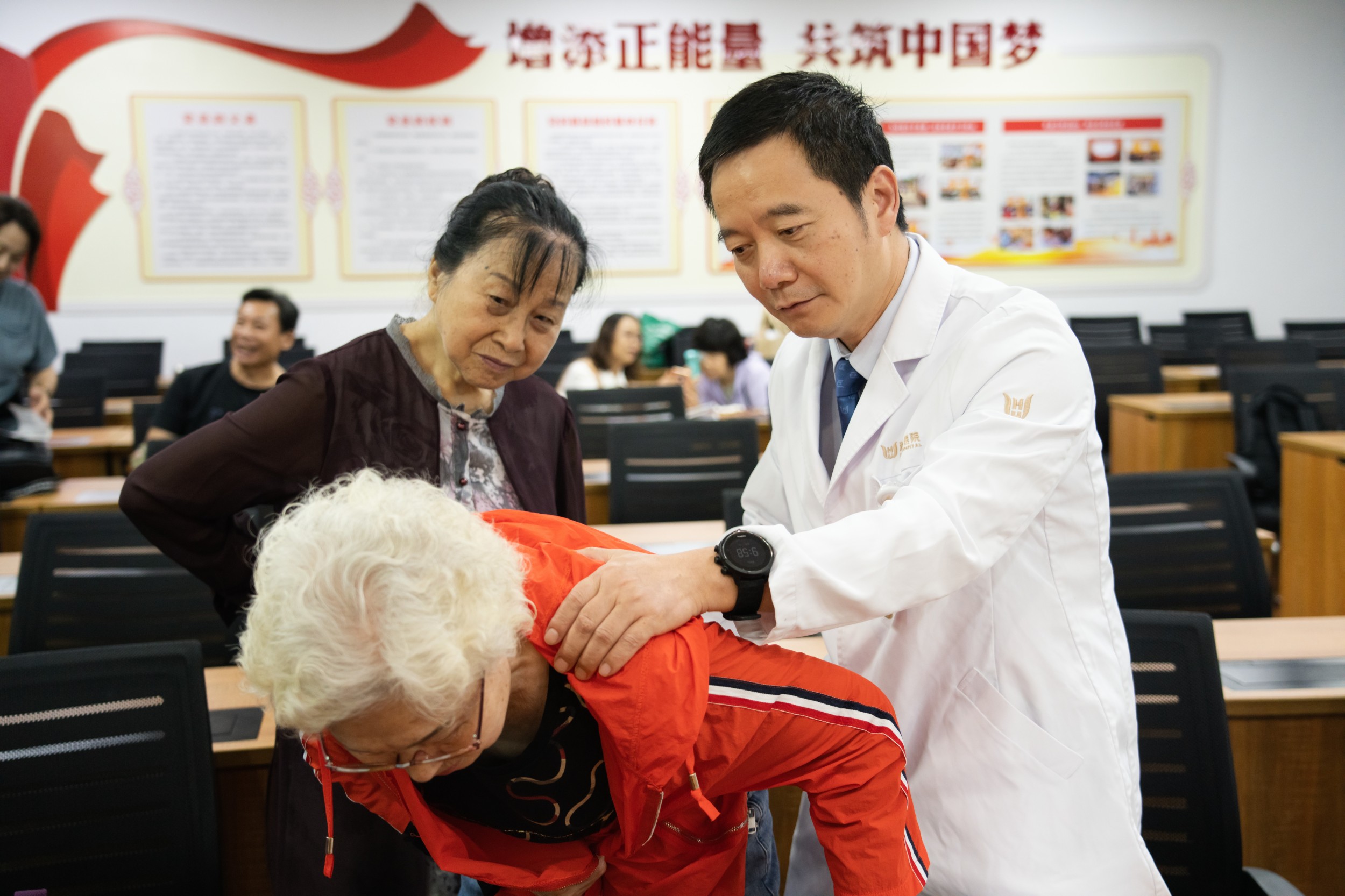 讲座结束后,和祐医院创伤骨科团队——章莹主任、陈智彪医生与王振虎医生,为老年学员提供了面对面健康咨询。72岁的陈伯曾因跌倒导致手腕骨折,现担忧膝盖疼痛影响运动,陈智彪医生建议其选择游泳、坐姿抬腿等低冲击训练,既能增强下肢力量又保护关节。章莹主任则针对多位学员的骨密度报告,逐一给出营养补充与锻炼建议,并呼吁家庭与社会协同关注老年人安全,强调“防跌倒是系统工程,需从细节筑牢防线”。