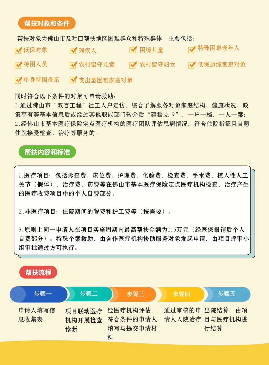 项目旨在以“双百工程”为抓手,联动慈善组织、社会组织、医疗机构、志愿者等资源协同推进,通过“医疗保障+慈善帮扶”的医疗救助模式,为佛山市及对口帮扶地区患病、符合住院指征且自愿接受治疗的困难群众和特殊群体,在佛山市基本医疗保险定点医疗机构开展检查、治疗等服务,缓解困难群众和特殊群体的看病就医压力,帮助他们改善生活质量,恢复社会功能,进一步探索“医疗保障+慈善帮扶”的医疗救助模式,完善基本民生保障体系。
