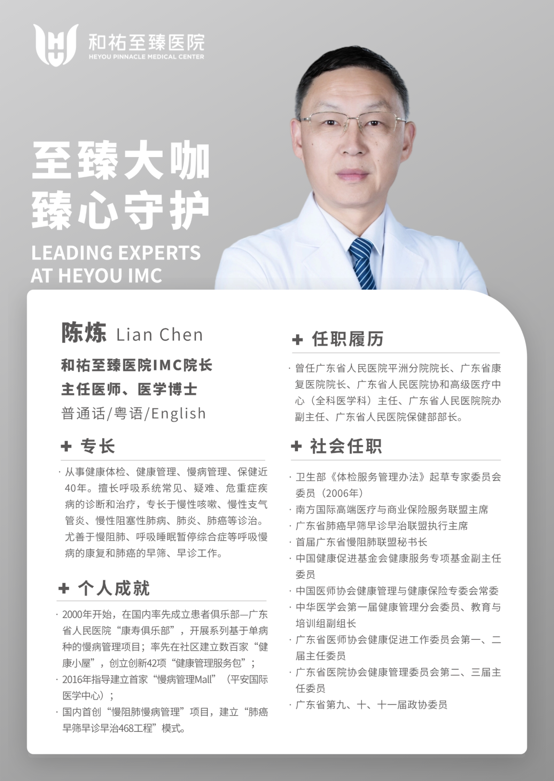 和祐健康管理中心由陈炼教授领航。 陈教授不仅是资深的医院管理者,更是一位经验丰富的临床专家(尤其在呼吸领域),长期致力于健康管理模式的创新与实践。