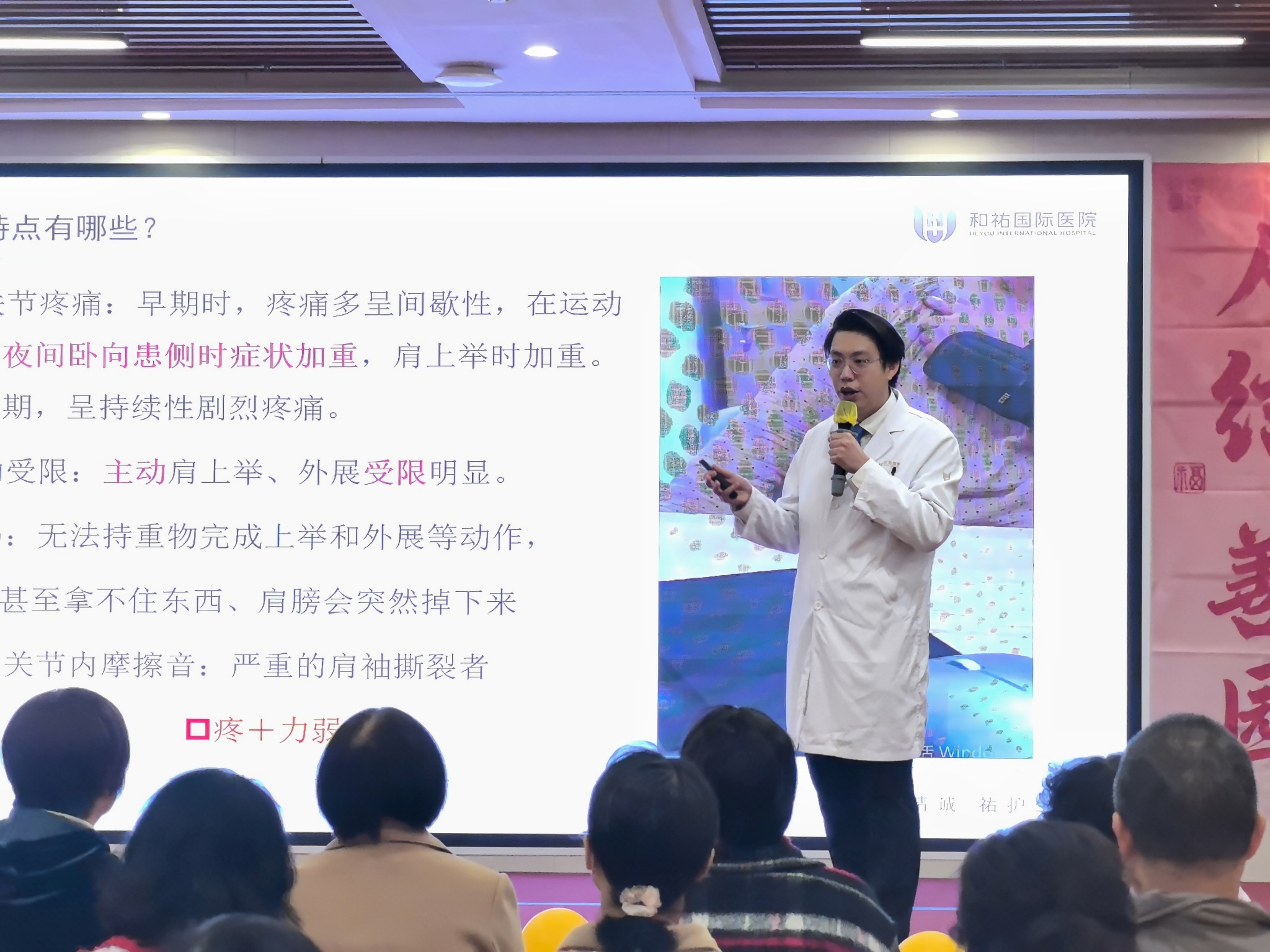 活动现场气氛热烈,骨二科杜兆源医生以"肩痛肩周炎和肩袖撕裂的科学鉴别"为主题,通过图文并茂的演示,为居民系统讲解肩周炎与肩袖损伤的区别。