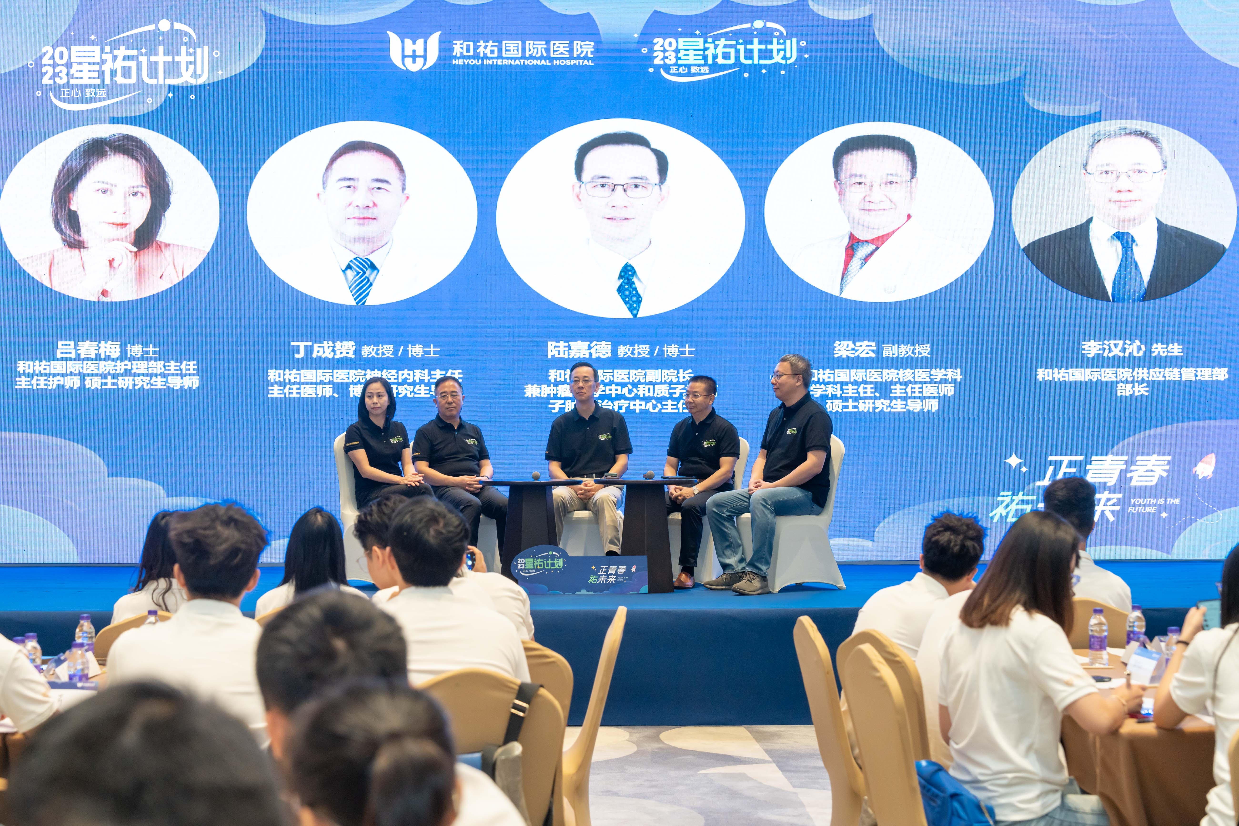 在大咖面对面环节,和祐国际医院项目副院长、肿瘤医学中心和质子重离子肿瘤治疗中心主任陆嘉德教授、和祐国际医院项目神经内科主任丁成赟教授、核医学学科主任梁宏教授、护理部主任吕春梅、供应链管理部长李汉沁等大咖上台,与“星祐”们面对面分享职业生涯经验,副院长郑其进为星祐详细讲解了和祐业务发展与学科规划。
