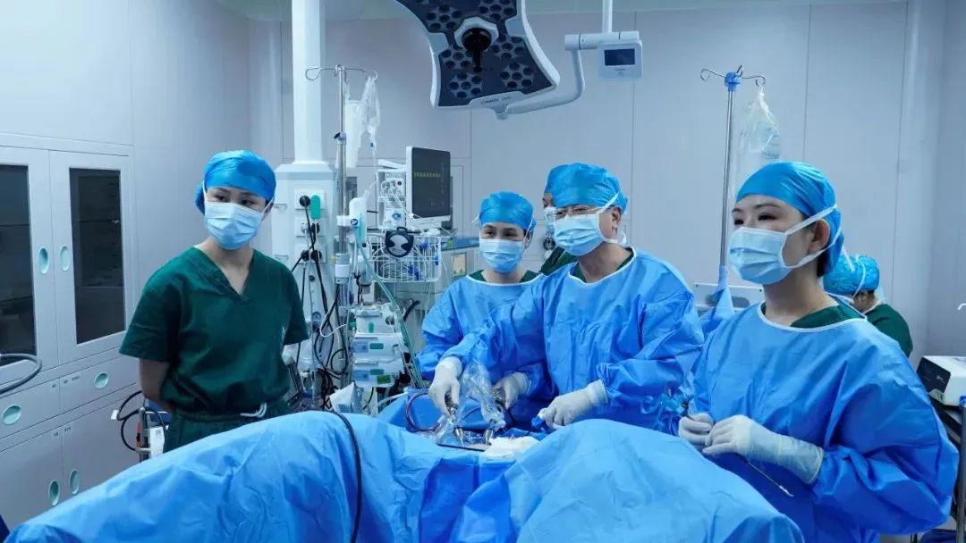 陈建国主任(右二)、杨小梅主任(左二)在开展腹腔手术(非本文案例手术)