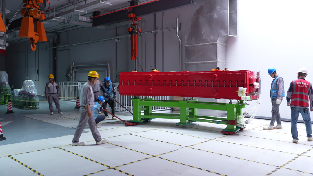 在和祐质子重离子中心的吊装现场,长达4米、重达20吨的核心部件——偏转磁铁缓缓升起,从位于质子重离子中心楼顶的吊装口精准吊入,与基座平行吻合。随着核心部件的逐步到位,复杂而庞大的质子重离子一体化设备初具雏形。
