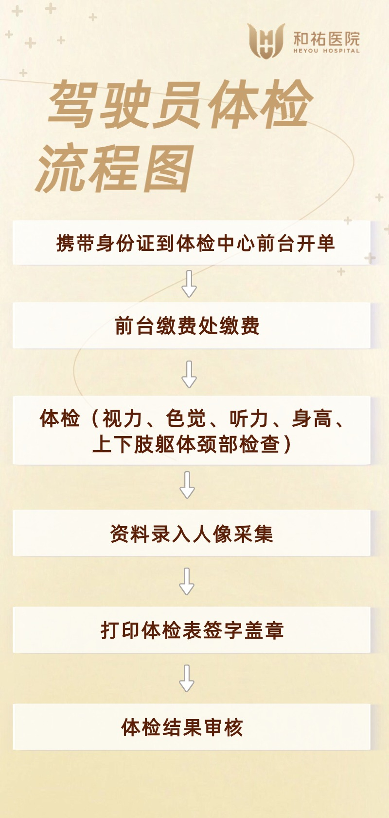 和祐医院体检中心现已开通驾驶员体检,周一至周日下午14:00-17:00可以安排上,方便快捷,助您换证及驾照年审无忧!咨询电话:28681668,具体流程如下: