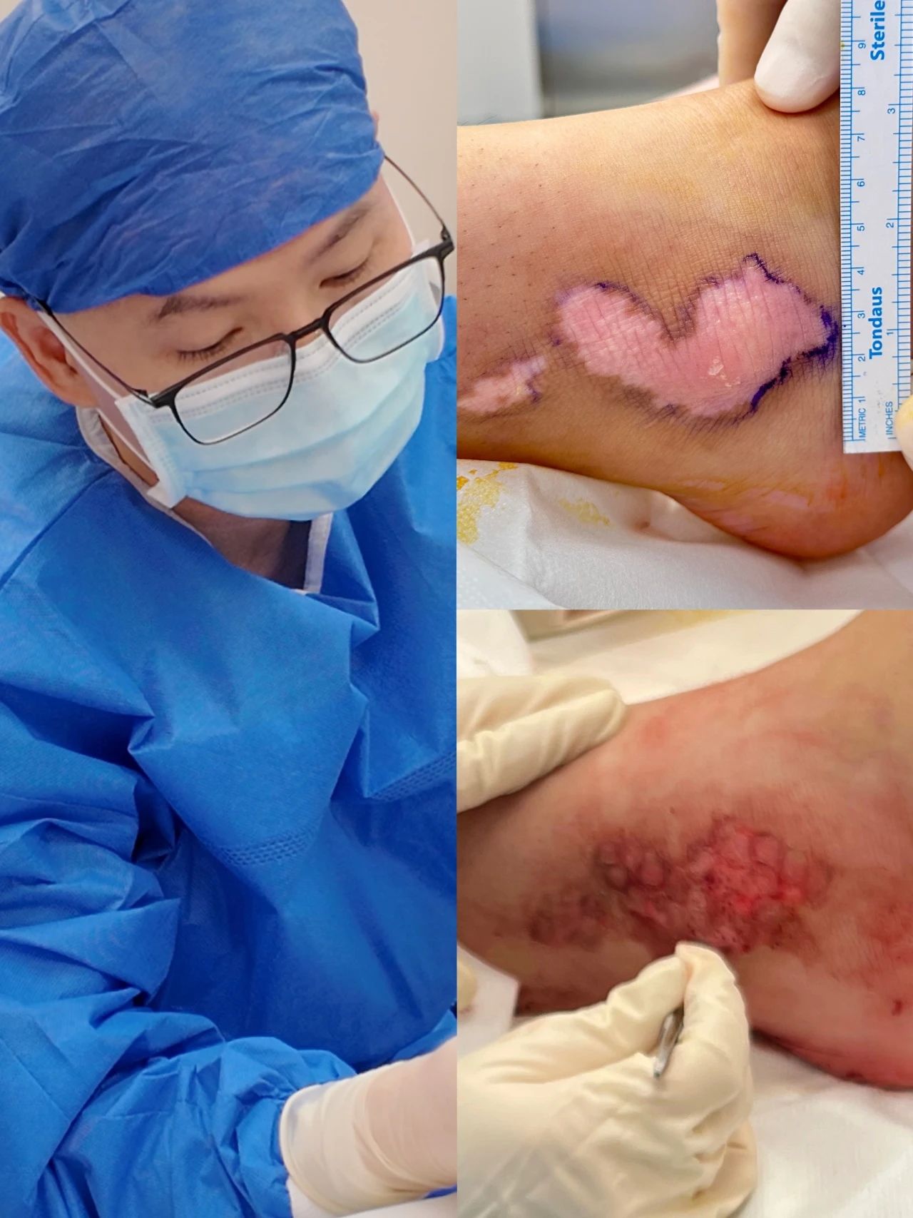 第一台是15岁男孩,白斑位于最难治的手足部位(白斑面积单块最大达6.5cm*4.2cm,总面积超过100cm²),第二台是10岁的女孩,白斑位于右小腿和膝盖周;局部以复方利多卡因乳膏行表面麻醉,皮肤科团队凭借丰富的协作经验,熟练应用皮肤分离仪和钻孔手术动力系统,整个手术过程在与患者轻松愉悦的交谈中顺利完成。