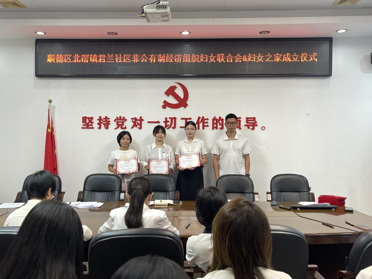活動現場,君蘭社區“兩委”班子成員為北滘鎮君蘭社區非公有制經濟組織婦女聯合會和婦女之家的成立頒發牌匾。