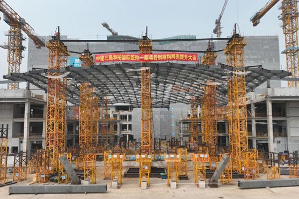 3月18日下午16时30分,随着8个提升架上8台液压提升器同时发力,重约400吨、总高度23.37米的和祐综合楼曲面网壳结构屋盖缓缓上升,在历经8个小时的紧张有序施工后成功提升到位。
