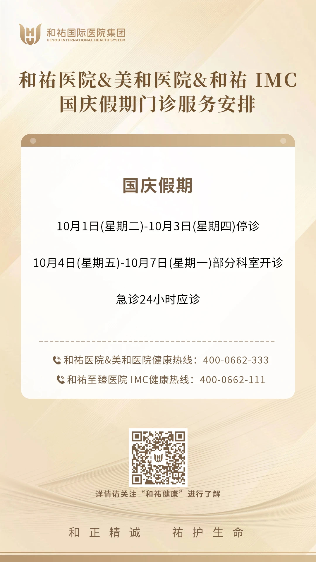和祐医院、美和医院、和祐IMC国庆假期门急诊安排